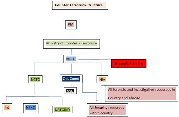 The answer lies in creating a separate Counter Terrorism Ministry directly under the Prime Minister. A National Counter Terrorism Head (NCTH) will head the CT body in the country. The NCTH will be the single point authority in the country for all CT activity with authorization to muster all resources within the country. The authority vested in him will be matched by his accountability to every terrorist strike. He should be made accountable and answerable to the Parliament either directly or through a body nominated by the parliament. A Strategic Planning body with specialists from various fields will be placed directly under him.