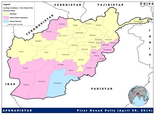 According to the final result of the first round of voting held on April 05, of the total 34 provinces in the country, Abdullah was the first leading candidate in 19 and second leading candidate in six provinces. Ashraf Ghani was the first leading candidate in 14 and the second leading candidate in 10 provinces. Zalmai Rassoul, who ended on third position, had emerged as the leading candidate only in the southern Kandahar Province (see Map 1 below).