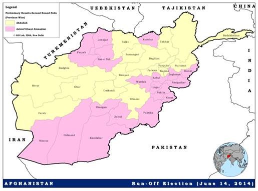 Map 2: Abdullah and Ashraf Ghani Ahmadzai as Leading Candidates (Province-Wise): As per the Preliminary Results of the Run-Off Election Held on June 14, 2014