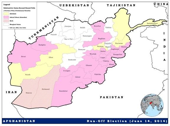 Though both the candidates gained in other provinces as well, but the increase in their share of votes in these provinces was comparatively marginal. In the northern Takhar Province, Abdullah retained his lead by a narrow margin. Similarly, despite making substantive gains in Kabul, Ashraf Ghani won Kabul from Abdullah only by a small margin. In another instance, as shown in the above map, though Ashraf Ghani emerged as the leading candidate in the southern Nimroz and Helmand Province, both the candidates had made substantive gains in terms of their respective share of votes in the two provinces compared to the first round of elections.